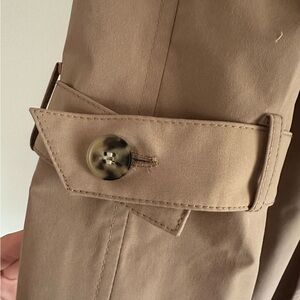 Stylish beige trench coat. Features double-breasted front. Includes belted waist and cuff straps. Reposhing without wearing only because its too big for me