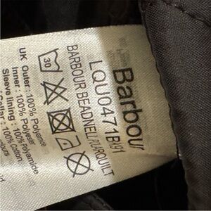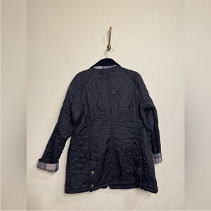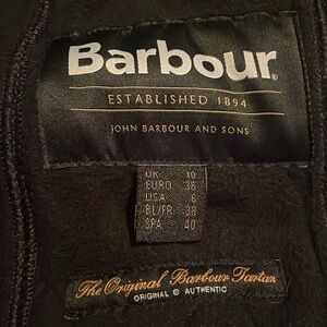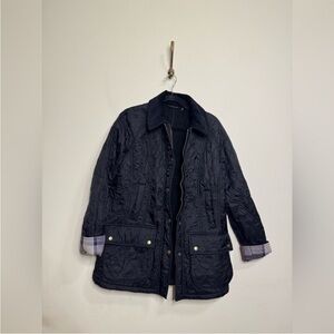 Stylish Barbour jacket. Quilted design. Gold button accents. Perfect for cool weather.