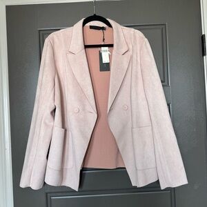 Chic pink blazer by Anthropologie. Features a classic lapel and double-breasted design. Perfect for a polished look.