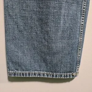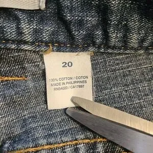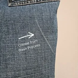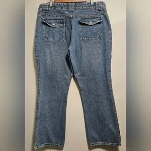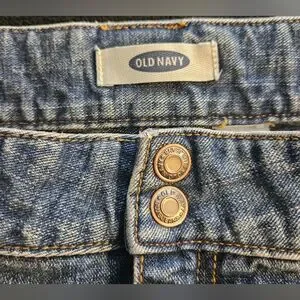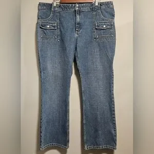 Old Navy medium wash boot cut style jeans in excellent pre-owned condition. These jeans feature a classic medium blue wash, dual button closure, and stylish trouser pockets on both the front and back. Made from 100% cotton, they offer a comfortable fit with a flattering wide leg silhouette. The pictures of the tag show these jeans were made in Fall of 2002. Perfect for a vintage-inspired look or comfortable everyday wear. Please note the tag indicates the size is 20.