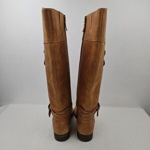 Stylish tan heeled boots. Features buckle detail. Perfect for any occasion.