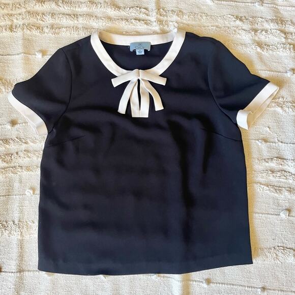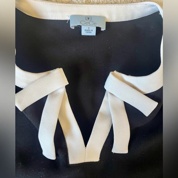 This CeCe blouse features a chic black and white design with adorable bow tie accents on the collar and sleeves, perfect for both casual and dressy occasions.