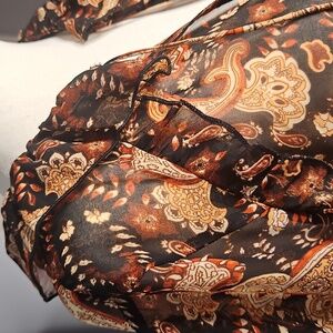 Long sleeve, semi-sheer red and black paisley bodysuit with ruffle details. Can wear to work, and then for dinner date after.