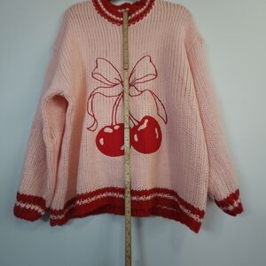 Charming sweater with cherry and bow design. Soft pink knit with red accents. Perfect for a playful look. Super comfy and warm perfect with leggings. Worn ONE time for valentines day.