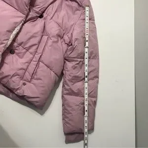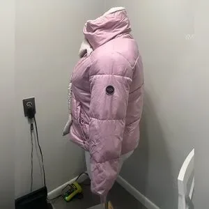 Elegant light pink puffer with cozy cream lining. Ideal for chilly days. Stylish and warm.