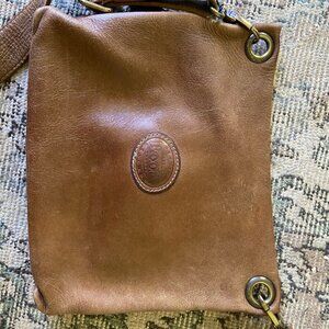 Roots brand from Canada, genuine brown leather, gold hardware, long adjustable shoulder strap. Great small to medium size for everyday essentials. Measures 11" wide by 8.5" tall.