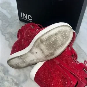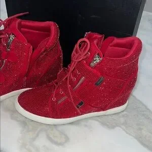 Shimmering red high-tops with dazzling embellishments. Elevate your look with these stylish sneakers.