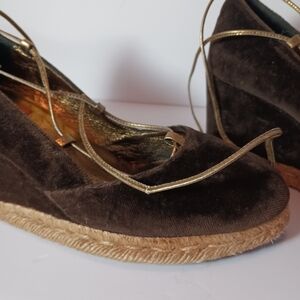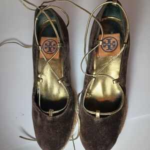 TORY BURCH Brown Velvet Espadrille Wedges Ankle Tie Sz 8.5 WornButNotWornOut. Midweight deep brown velevt uppers with scant scuffs mot noticeable when worn. Thin gold ties both with a weak spot see pic. Espadrille bottom and heels with some wear see pics priced accordingly. Lining worn but clean. Lovely Boho chic by Tory Burch!