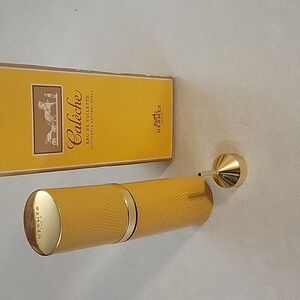 Elegant Hermes bath and body tool set. Features a yellow and gold design. Includes a refillable bottle and accessories.
