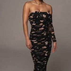 Chic one shoulder lace dress by JLUXLABEL. Features a striking black and nude design. Perfect for evening elegance. Stretchy!