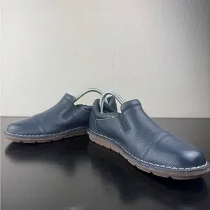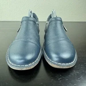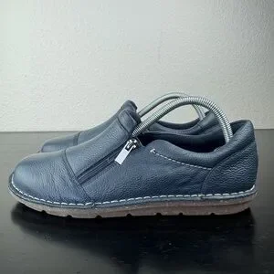 The Collection Clarks Tamitha Cattura Leather Women's Navy Blue Zippered Shoes in size 6.5 are a stylish and comfortable choice for various occasions. Featuring a round toe shape, slip-on closure, and flat heel, these loafers offer a classic and versatile style. Made with leather upper material and lining, with a foam insole for added comfort, these shoes are suitable for travel, activewear, casual outings, and workwear. The navy blue color and solid pattern make them a great addition to any wardrobe, while the rubber outsole ensures durability and traction. Condition is excellent with very little wear.
