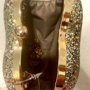 Dazzle with this heart-shaped clutch featuring a stunning glitter design. The gold chain adds a touch of elegance, making it perfect for any special occasion.
