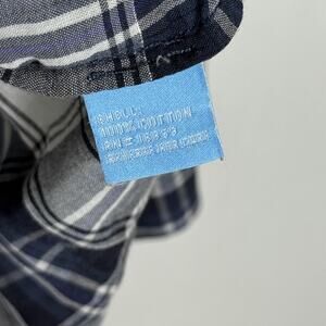 J McLaughlin Shirt Womens Large Navy Blue White Plaid Tunic Band Collar Pockets
