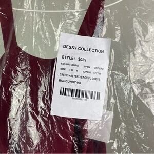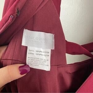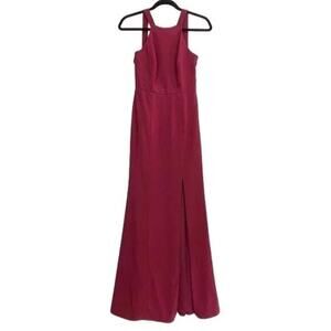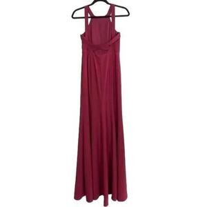 Elegant burgundy dress. Sleeveless with high neckline. Features a stylish back design. Perfect for weddings.