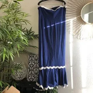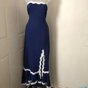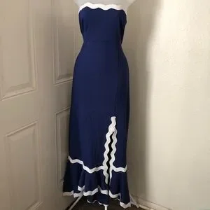 Navy Blue White tube strapless scallop edge long maxi dress with white trim slit