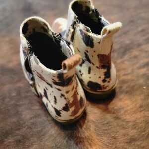 These faux cowhide booties are so fun! So many outfit options with these! They have double zippers on the side and you can play with the height that you put the zippers for a different look!