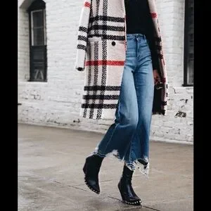 Tags: casual, denim, relaxed, wide leg, flared jeans, blue jeans, distressed, ripped, raw hem, high rise, daily