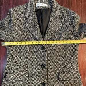 The Mackintosh Women Coat is a classic and stylish outerwear piece made from a wool blend with a herringbone pattern, perfect for the winter and fall seasons. This mid-length coat features a collared front and pockets, making it versatile for various occasions from casual to workwear. This is a Misses size 14 The black color and tweed fabric add a touch of sophistication, while the long sleeves and button closure provide practicality and comfort. The coat is designed for a regular fit and is lined with polyester for added warmth, making it a timeless and elegant addition to any woman's wardrobe.