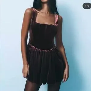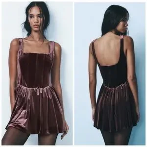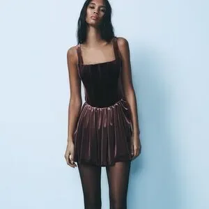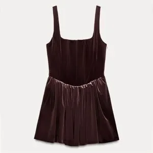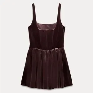 Short dress with square neckline and wide straps. Side hidden in-seam pockets. Pleats at waist. Hidden zip closure at side.