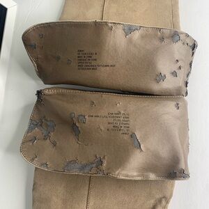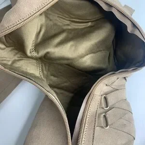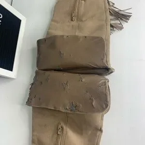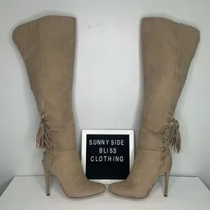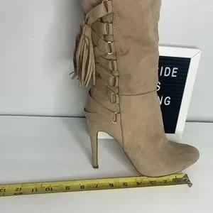 These are light brown faux suede thigh-high stiletto boots from ShoeDazzle they feature a lace-up back and tassel detailing. They are perfect for a night out, dressing up or a holiday party. They’re a size 7.5 in good pre-owned condition. The inside top lining shows some flaking (See Photos)
