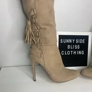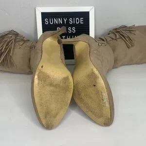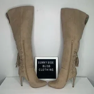 ShoeDazzle Tan Faux Suede Thigh High Stiletto Boots Tassel Lace Up 7.5