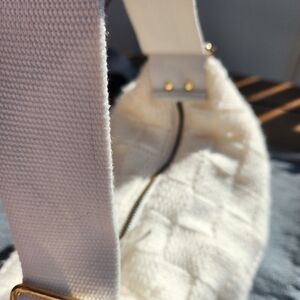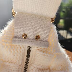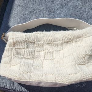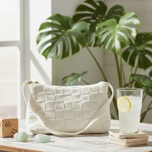 Step out in a cozy, sophisticated style with this beautiful ivory knit shoulder bag, featuring the distinctive "Cozy Checkerboard Braid" texture. It uses a thick yarn in an intricate woven pattern, giving it a unique "sweater" feel. The versatile off-white color and classic baguette shape are complemented by a sturdy canvas strap and tasteful gold-tone hardware. This refined bag is the ideal companion for your seasonal outfits, offering soft, chic luxury.