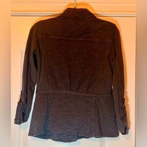 Anthro Saturday Sunday gray knit jacket featuring textured portions. Features roll sleeve & both a zipper and snap enclosures. Stay stylish and comfortable with this chic charcoal gray jacket. Jacket is in good used condition.