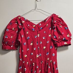 Elegant red dress with a charming floral pattern. Perfect for any occasion.