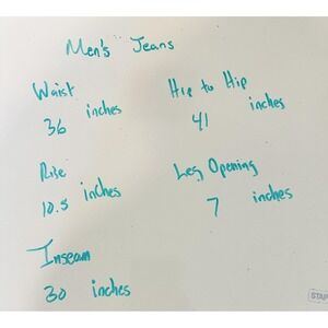 Measurements from board in photos: Waist 36 inches; Hip to Hip 41 inches; Rise 10.5 inches; Inseam 30 inches; Leg Opening 7 inches