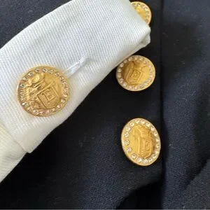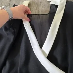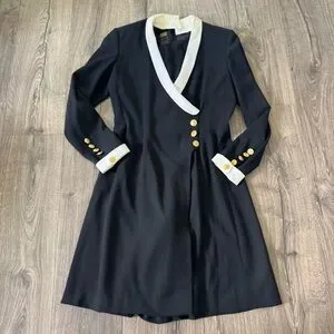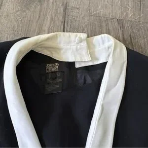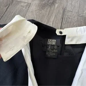 Vintage Escada Couture Black, White, and gold Long Sleeve romper Dress with Gold Accents size 36. Beautifully made and unique features! The v cut also have a black sheer lining and the collar can be adjusted. Signs of wear as pictured on the neck area. This is a vintage Escada piece truly unique and a hard find. ๐ offers welcome ๐ค Y2K