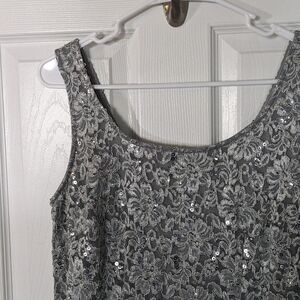 Women, Woman, Women's, Size 12, Silver, Sequin, Metallic, Sequins, Metallic, Pretty, Femme, Feminine, Formal, Semi-Formal, Midi Length, Midi Dress, Dress, Prom, Homecoming, Stunning, Beautiful, Girly, Sleeveless, Zip Up, Zip-Up, R&M Richards, EUC, Dressy, Evening, Date Night, Night Out, Opera Dress, Back Slit, Slit, Sexy, Evening, Event, Special Occasion, Lace, Lacey, Lacy, Floral, Floral Lace, Lace Overlay, Sparkly, Sparkles