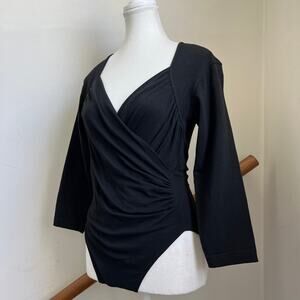 Vintage Gold Label Victoria Secret 1980s Long Sleeve Bodysuit Black Cotton Surplice Wrap