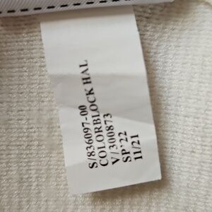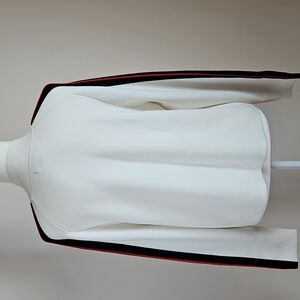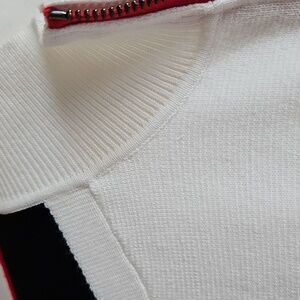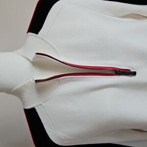 Banana Republic women's size XL Lenzing Ecovera splash substantial stretch knit sweater "colorblock Hal" , in white with black/ red sleeve stripes, red zipper placket, from 2021-22. pre-owned in excellent condition. substantial weight, fabric 86 rayon, 14 viscose.