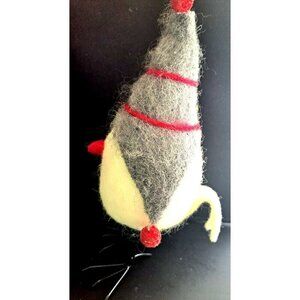 Felted Cream Colored Bird in Gray and Red Stripe Gnome Hat Black Wire Legs