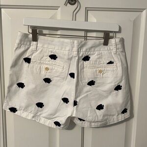 J. Crew Chino Shorts, size 6, embroidered navy blue fish motif, front zip, back pockets, front slash pockets, 4 inch inseam, gently worn in great condition, no stains, tears, etc.