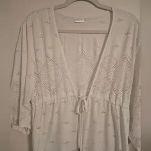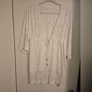 Stay stylish at the beach with this elegant white eyelet swim cover-up. Perfect for adding a touch of sophistication to your swimwear ensemble.
