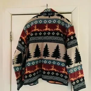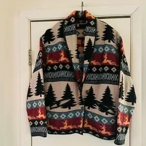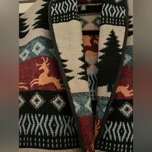 Stylish cardigan with a unique pattern featuring trees and deer. Perfect for adding a touch of nature to your wardrobe.