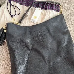 Tory Burch Hobo Tassel bag and matching wallet in black. Like new, smoke free home. Comes with dust bag.