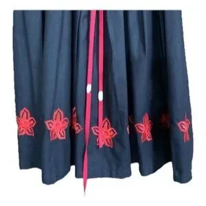 This vintage Dirndl dress from the 1970s features a unique design with black and red floral embroidery, giving it a gothic style. Made from a cotton blend material in Germany, this corset dress is a size 36 and perfect for special occasions. The dress exudes a retro charm with its original craftsmanship, making it a standout piece for any vintage clothing collection. Due to
