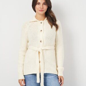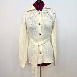 ZARA Ecru Lapel Collar Wool Blend Knit Belted Cardigan sz L