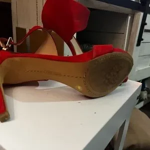 Elegant red heels with ankle strap. Open toe design. Perfect for any occasion. Unworn. Beautiful shoe, just wasn't my style.