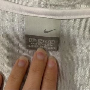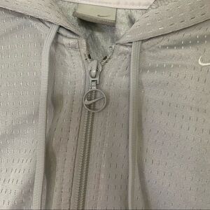 Nike Perforated athletic jacket with hood size xs. Light gray with yellow and white stripes down sleeved. It has pockets, zipper closure that opens from top and bottom with a. Double zipper. His die has drawstrings.