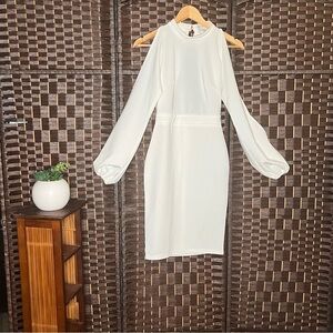 White Sheath Dress with Bishop Sleeves and Cold Shoulder