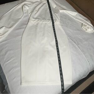 This stunning white sheath dress features elegant bishop sleeves and a chic cold shoulder neckline, perfect for a bride or cocktail event. The dress's sophisticated design and crisp color make it ideal for formal occasions.