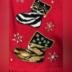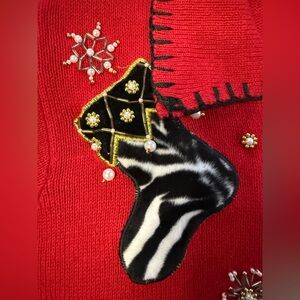 Casual, modest, Christmas, sweater, cardigan, long sleeve, ugly Christmas sweater, UCS, animal print stocking, faux fur, beaded, embroidery, embroidered