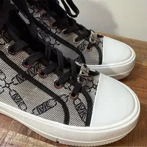 Elevate your look with these Michael Kors sneakers. Monogram pattern in black and white. Stylish and versatile for any occasion.