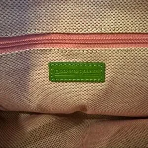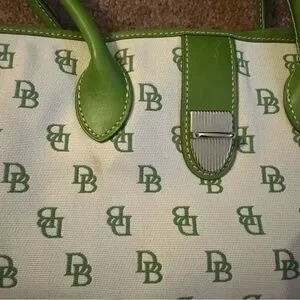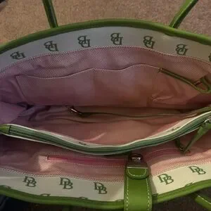 Stylish shoulder bag with green accents. Features iconic logo pattern. Perfect for everyday use.