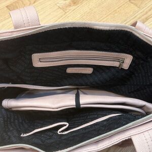 Steve Madden quilted diaper bag blush and rose pink! Super roomy and comes with an attached clear bag for storing moms essentials, wet clothes etc! Also comes with changing pad. Shoulder strap and logo adjustable long strap that can be worn crossbody. Good to very good condition. Some light handle wear and light discoloration on the strap.
