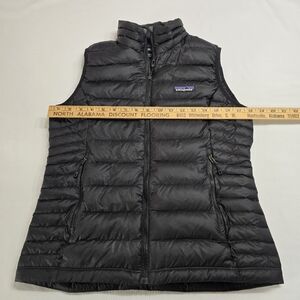 Patagonia Goose Down Puffer Vest Zip Up Black Women's Size Small Goosedown. Preowned. See photos for approximate measurements. Zippers tested and work. No holes or tears.