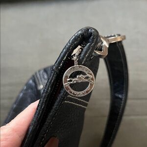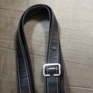 Beautiful thick, soft, luxurious black leather. White stitching with silvertone hardware and zipper closure. Crossbody strap is removable, not adjustable. Strap and corners excellent